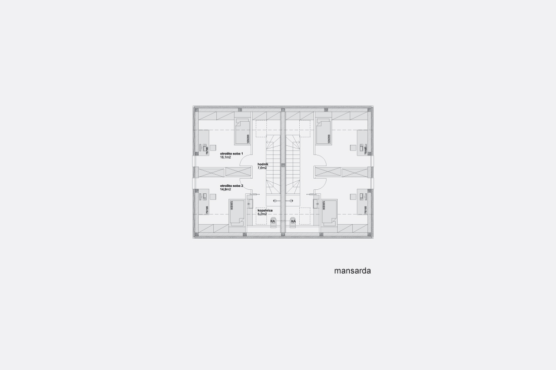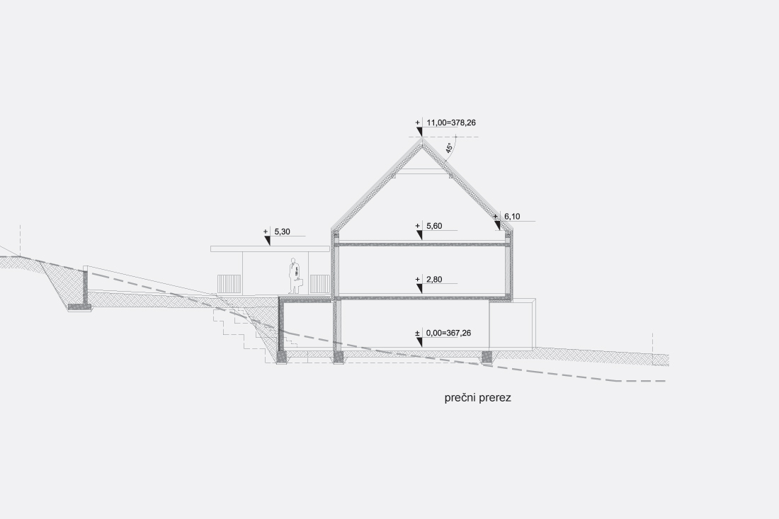 Načrtujemo projekt stanovanjskega dvojčka. Objekt se umešča v teren v naklonu do katerega se z dovozom dostopa do srednje etaže objekta. V spodnji etaži je predviden večji dnevni prostor z izhodom na velik zasebni vrt. Ena stanovanjska enota ima 150m2.