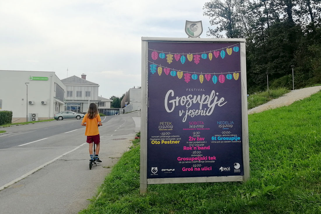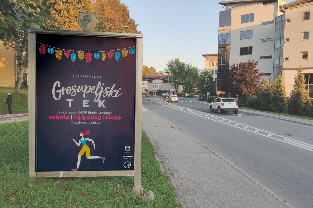 Z Zavodom za Turizem Grosuplje smo pripravili novo podobo festivala Grosuplje v jeseni. Festival je po motivu jesenskega listja grafično prepoznaven že desetletje. Z novo podobo smo ga ohranili kot osrednji motiv in predrugačili, da smo ujeli karakter dogodka (zabava, raznolikost, druženje). Za enega od dogodkov festivala Grosupeljski tek smo naredili tudi oblikovno različico.