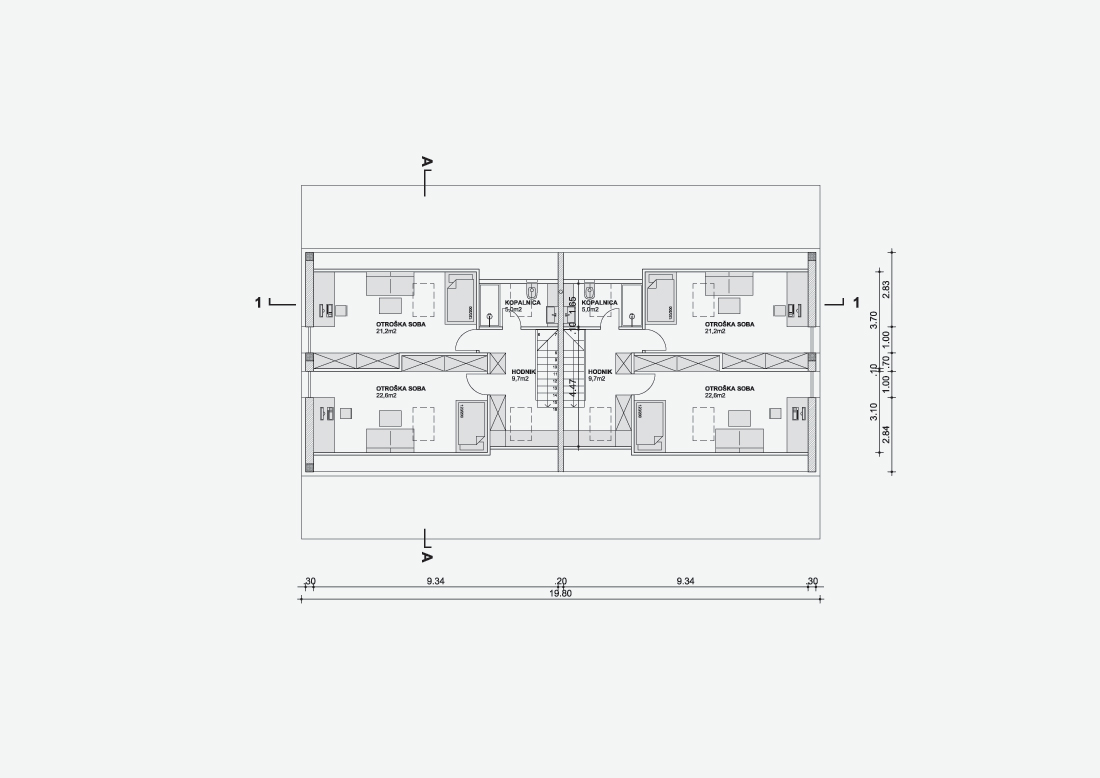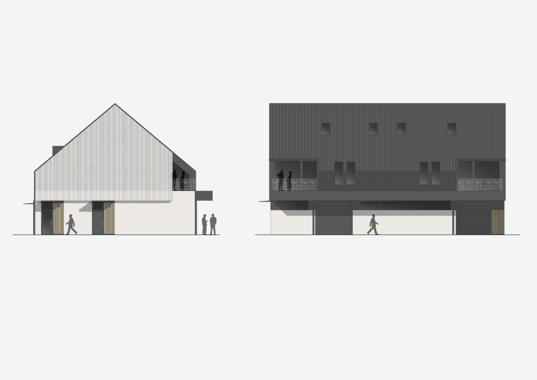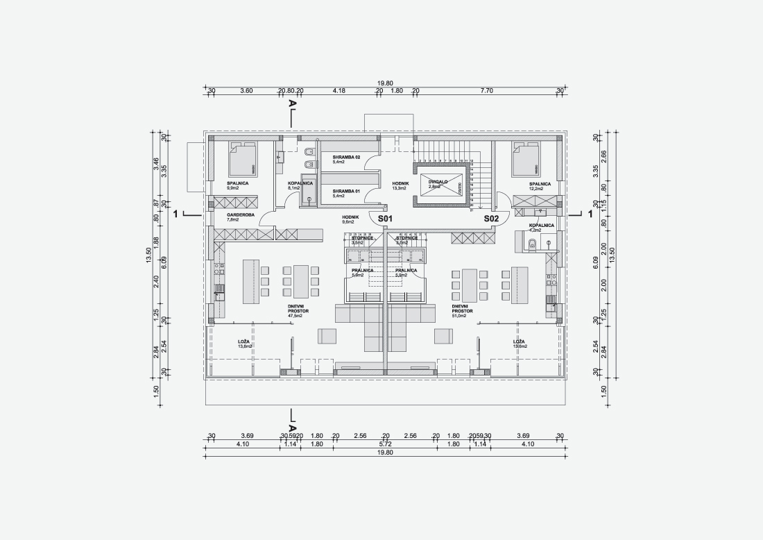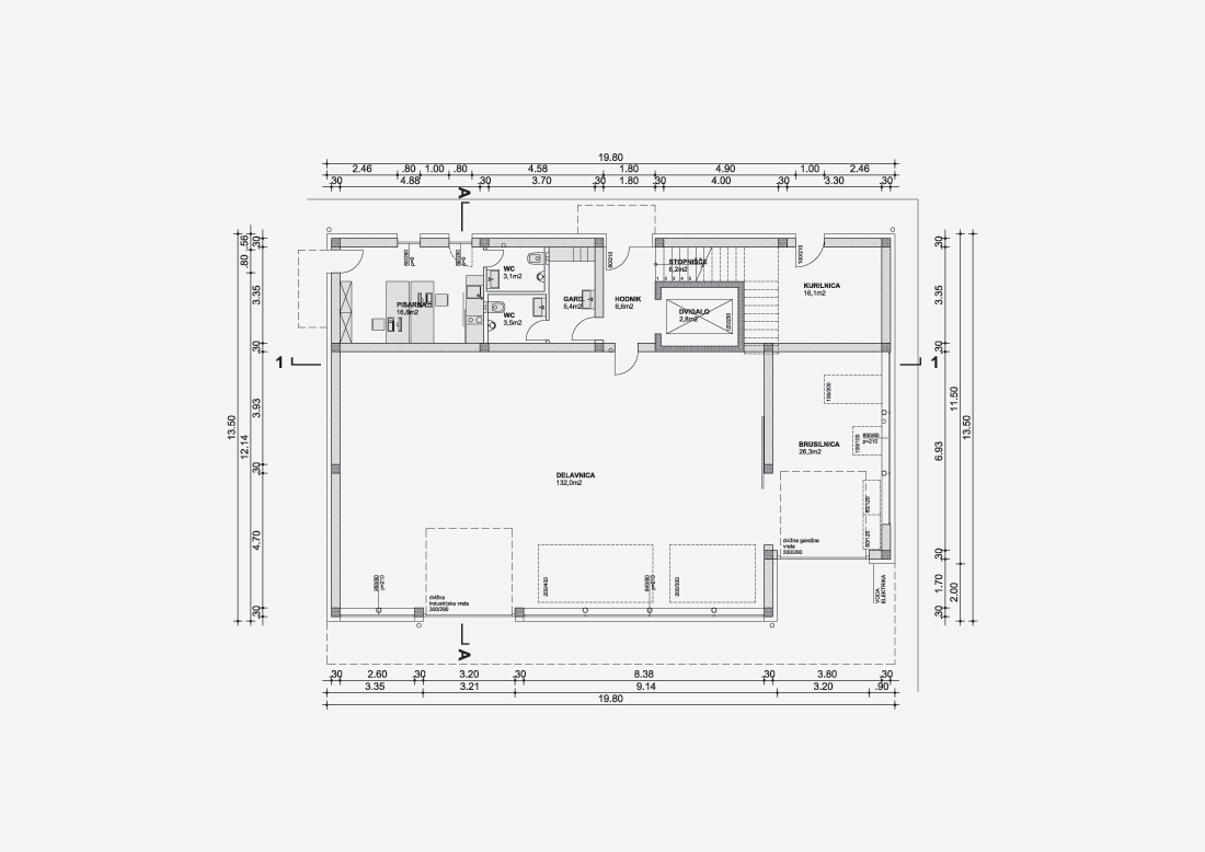 Večnamenska hiša na Radenskem polju pri Grosuplju. V pritličju je obrtniška delavnica s pisarnami, v mansardi sta urejena dva simetrična stanovanja, vsak v dveh etažah. Objekt ima vgrajeno dvigalo.