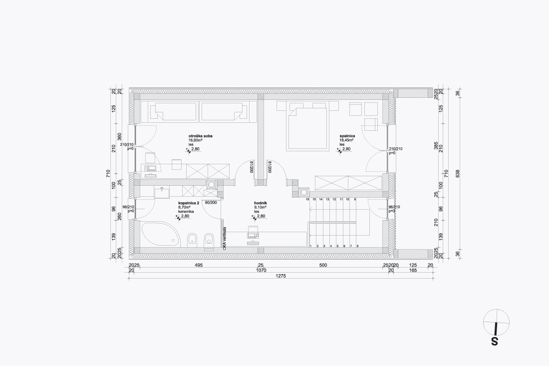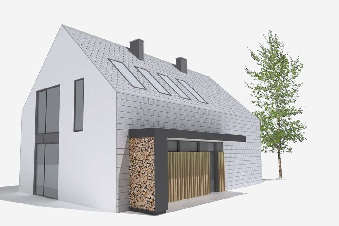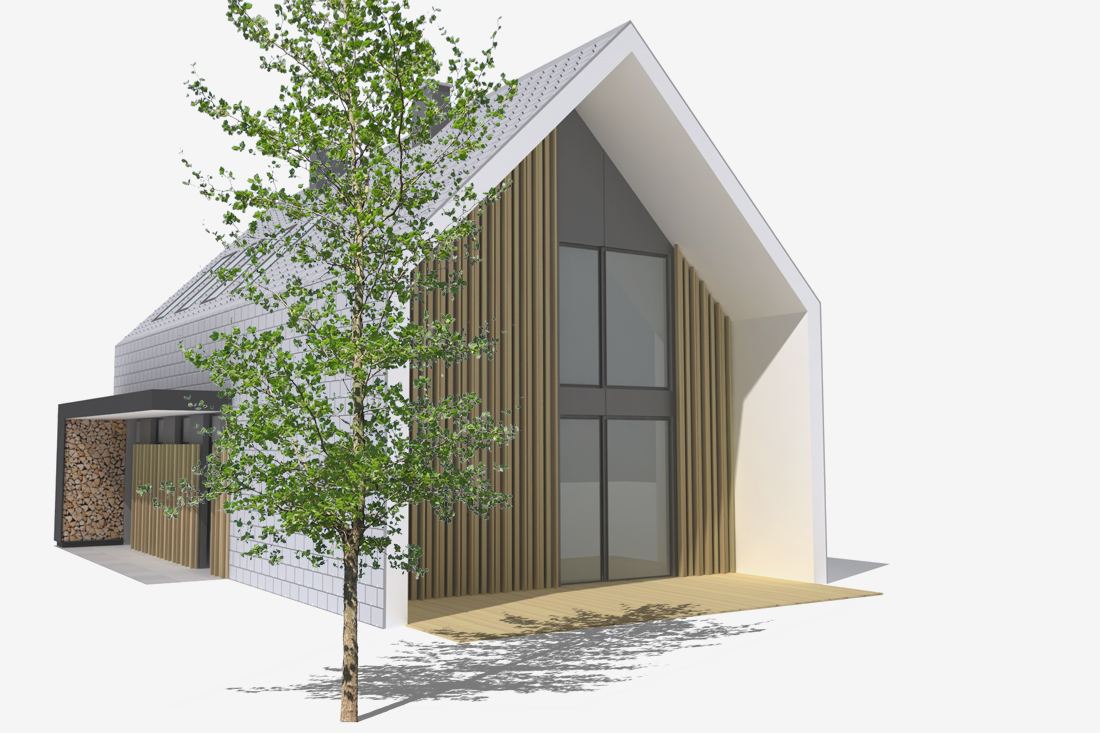 Zasnova enostanovanjskega objekta na podeželski lokaciji ob Smledniškem hribu. Pogoji na in ob parceli nas usmerjajo v odpiranje objekta na krajših, čelnih fasadah, ki ju obdaja plašč vlaknocementne obloge.