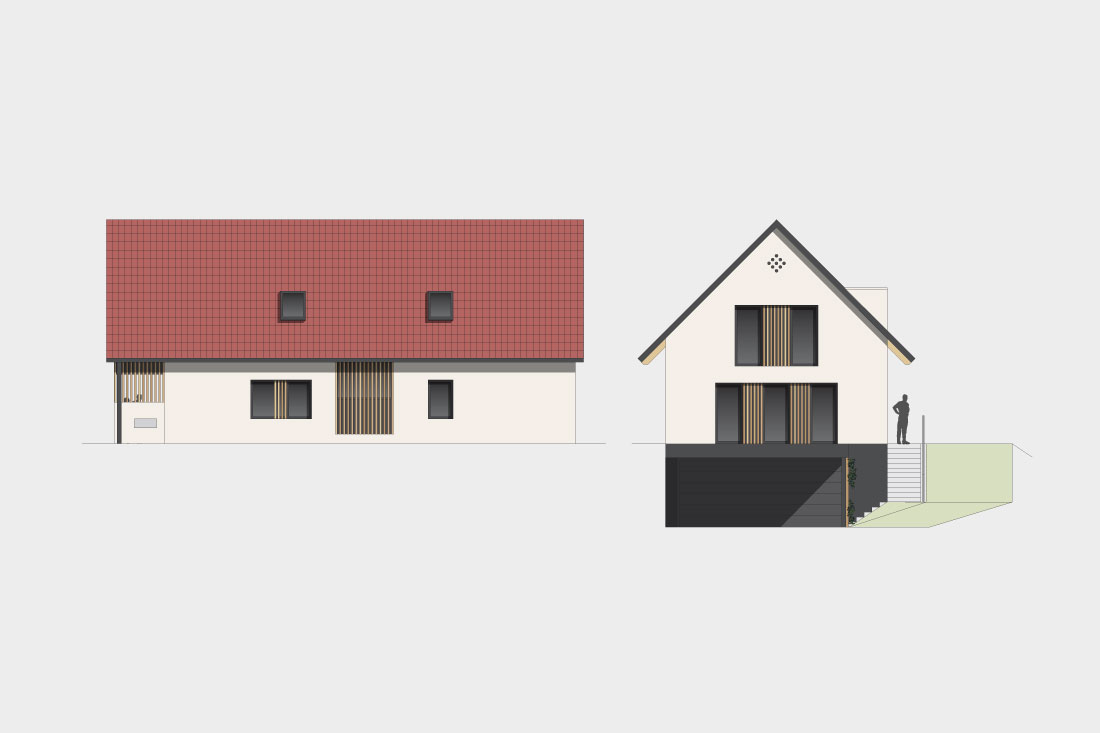 Veseli nas, da ima investitor simpatijo do kvalitetne okoliške arhitekture, zato skušamo vpeljati nekatere tipične tradicionalne arhitekturne elemente, kjer tipično ometano fasado kombiniramo z raznimi lesenimi elementi. Izbor kritine v rdečkasti opečnati izvedbi nam narekujejo lokalni predpisi.