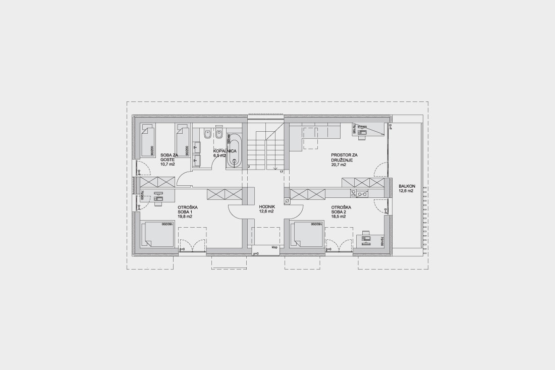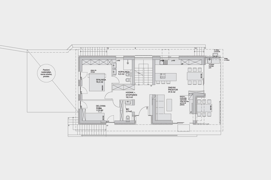 Za mlado družino snujemo nov dom na slovenskem podeželju. Posebna oblika parcele s terenom v naklonu nam v veliki meri narekuje oblikovanje hiše, ki ima servisne prostore in garažo v kletni etaži. Bivalni prostori v pritličju se s krasnimi pogledi odpirajo v smer sonca in na zeleni vrt.