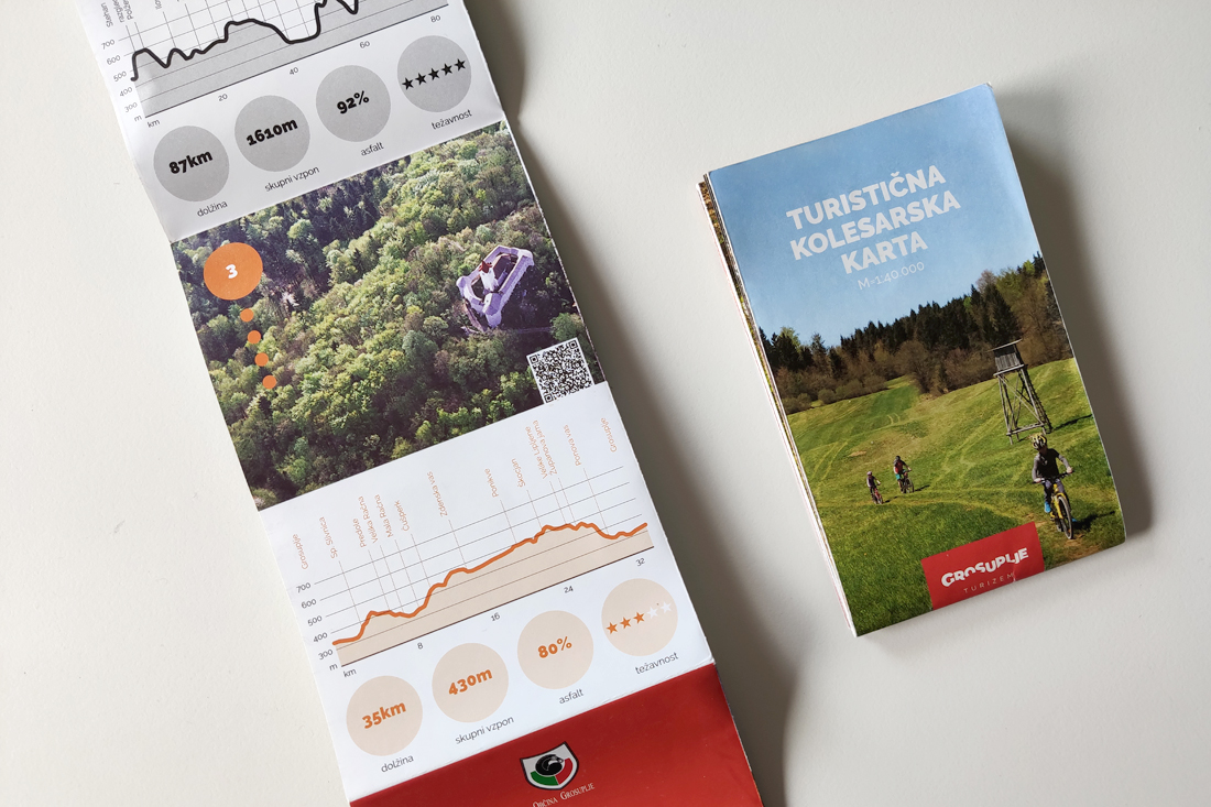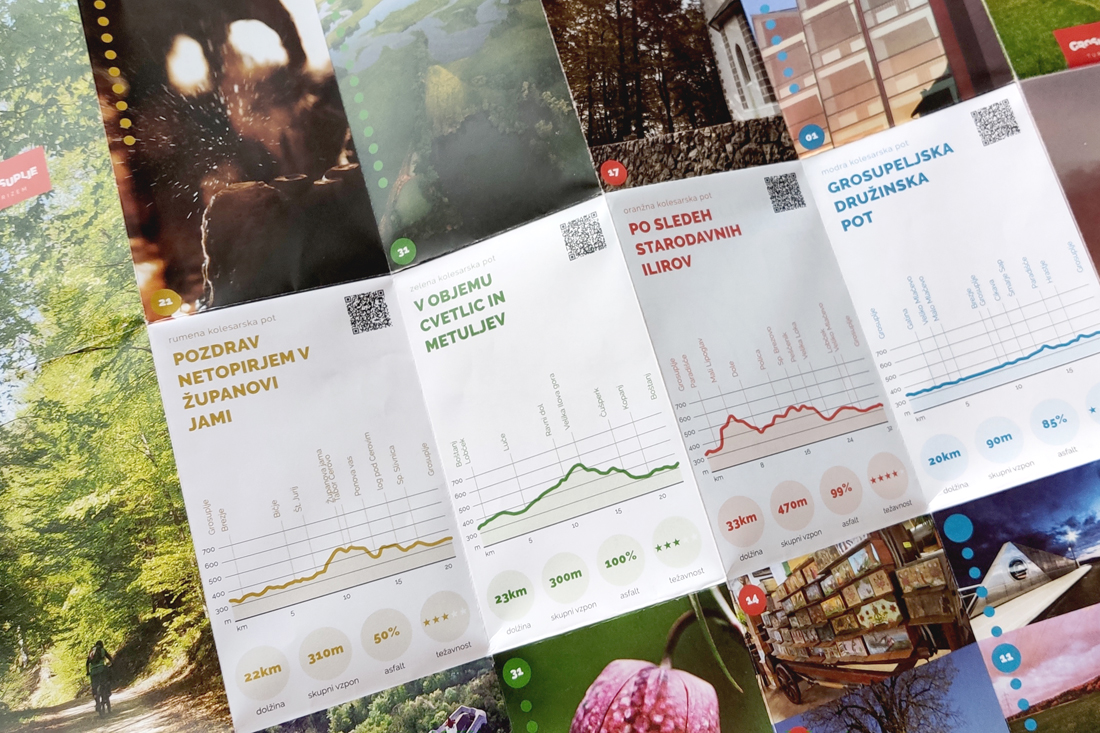 Oblikovanje dveh zloženk s kolesarskimi potmi okoli Grosuplja. Ena s turističnimi znamenitostmi, druga s poudarkom na odkrivanju zanimivejših kolesarskih poti. Žepna velikost s priročnim zemljevidom za vsak kolesarski žep. Za še boljšo uporabniško izkušnjo s QR povezavami, s katerimi se enostavno povežemo z našimi pametnimi napravami, da lahko brezskrbno navigiramo po poteh in znamenitostih okoli Grosuplja.
