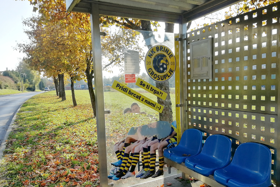 Za NK Brinje Grosuplje smo pripravili grafično podobo za avtobusno postajališče v neposredni bližini kluba in igrišč. Navihana ideja ne potrebuje posebne razlage.