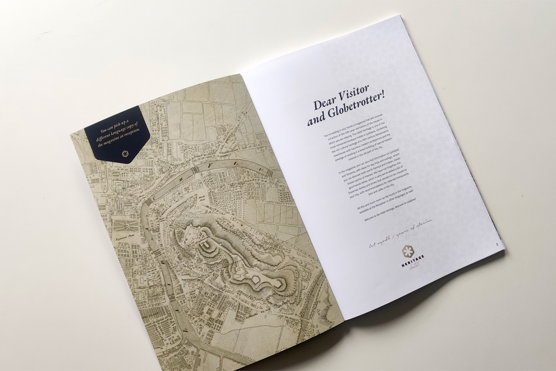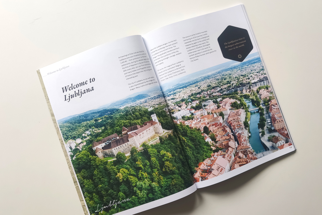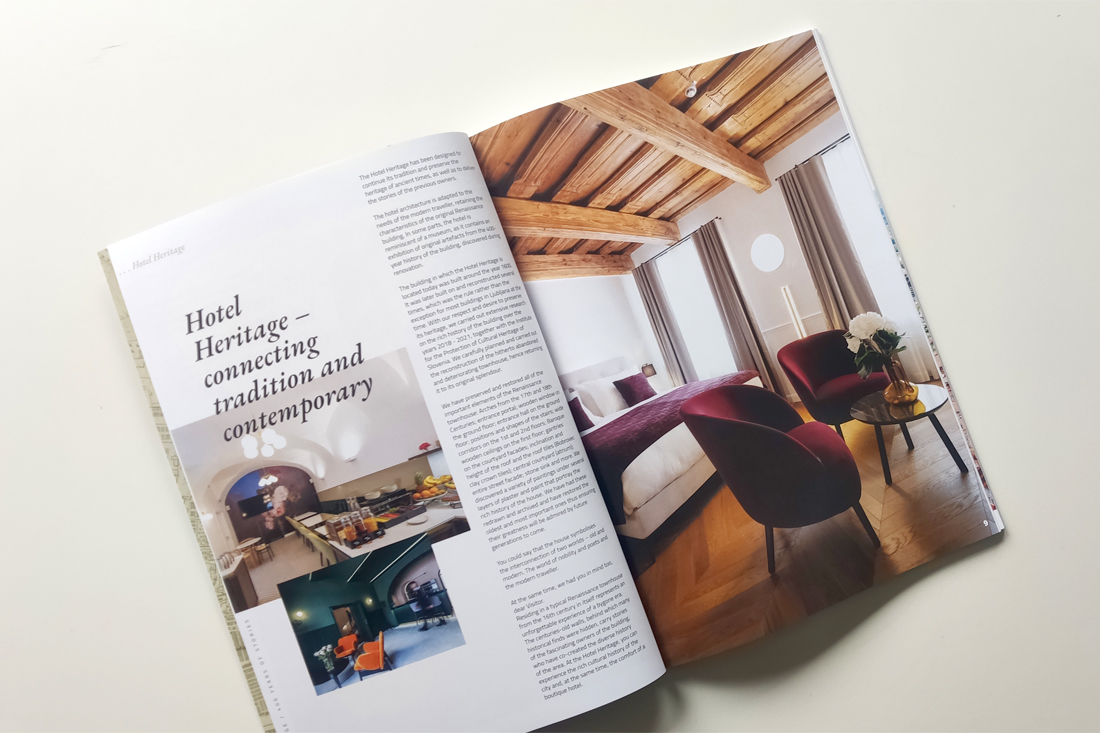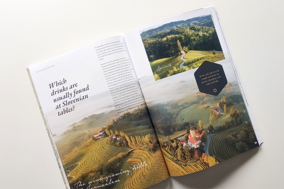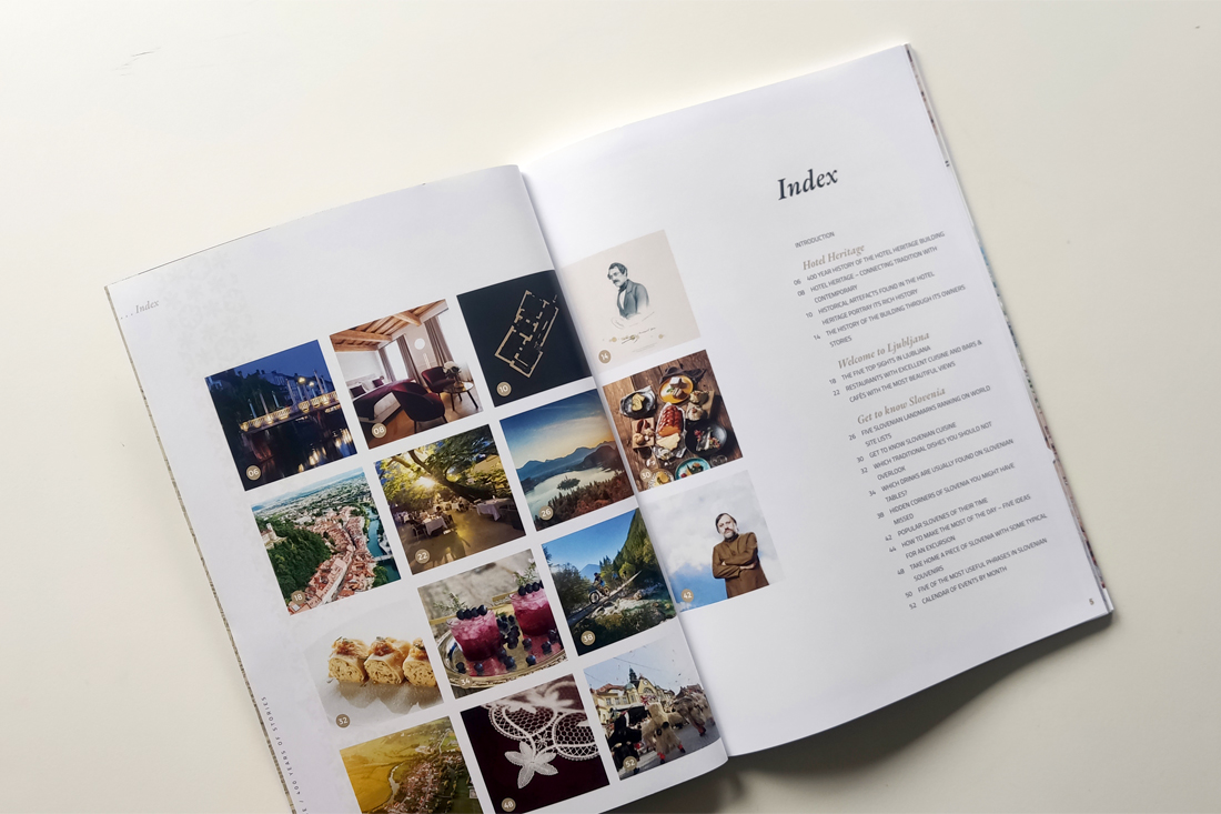 Za ljubljanski Hotel Heritage smo poleg celostne podobe oblikovali tudi hotelsko revijo, pripravili uredniški prelom revije, izbor fotografij in ji dodali ščepec idej in domislic. Revijo o hotelu, Ljubljani in Sloveniji smo pripravili v štirih jezikih, slovensko lahko prelistate v spodnji povezavi.